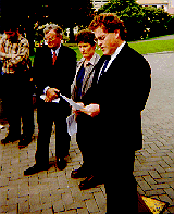 who have been tortured or have witnessed atrocities. At the moment their funding only allows them to provide this assistance to adults; children's and adolescents' needs are not being met. For more information (or to send donations) RAS Auckland, PO Box 5932, Wellesley Street, Auckland, tel (09) 377 8185; RAS Wellington, PO Box 6187, Marion Square, Wellington, tel (04) 384 7279. Finally on this ...Putting together this section on the NATO bombing has been extremely difficult, the mass media coverage is so narrow that we have tried here to provide a few alternatives. The situation is complex, and if we were to print out all the material we have received we would have literally tons of it. There are many snippets of news and views we would like to share with you - however, it would take a much larger publication than this newsletter to do so.Just on the one issue of why NATO is bombing Yugoslavia we have received a considerable amount of material - there are many ideas on why this is happening now and why it is happening to Yugoslavia. There is some puzzlement about why this particular situation of 'ethnic cleansing' is receiving such attention when there are so many examples going back over many years which have been ignored. The Triple Standard poster is one of many which give pause for thought - 'Tangata whenua want to know where NATO was during the ethnic cleansing of Taranaki and Waikato', then there was the intriguing Letter to the Editor (Dominion , 12-05-99) on the irony of the naming of the Apache helicopters, a people 'ethnically cleansed' from their homeland. Then there is the long and sad list of other peoples around the world being 'ethnically cleansed' today. As well there are the other human disasters which could have been averted if the kinds of resources that have been put into bombing Yugoslavia had instead been used to save lives - as but one example, the two to three million people who have died from starvation and malnutrition related diseases in North Korea during the past four years ... Included in this mailing are the latest NCCD Disarmament Times and the Peace Council's Peace Digest - both provide other perspectives on the bombing. For more information, those of you with internet access can check out our website - we are trying to keep the NATO bombing section updated with useful links and a selection of articles as they come in. Our website also includes the diary and photos of the protests in Wellington. Those of you who prefer printed material can send an SAE to the PMA office and we will send you an order form so you can choose the articles of particular interest to you. Stop killing the people of IraqAs you may be aware, it is not only the people of Yugoslavia who are subjected to regular bombing by US and British warplanes. After a temporary halt of three or four days while the bombing of Yugoslavia got underway, the almost daily bombing raids inside Iraq resumed. We understand from our US peace contacts that the Pentagon wishes to demonstrate 'their ability to simultaneously conduct wars on two fronts'. Lordy - what can you say about people with such ambitions ?As well, the economic sanctions which have had such a devastating impact on the people of Iraq continue - with no end in sight. On Thursday 8 April, a group of extremely hardy peace people and media representatives gathered in the most inclement weather on the steps of parliament for the presentation of the international petition calling for the lifting of the sanctions. Despite the grim purpose of our gathering, we were rather amused at the sight of the US flag flapping vigorously in front of parliament - it seemed so very appropriate given the current NZ government's sycophantic admiration of everything that is vile about the US government's foreign policy. April 8 was chosen as a day close to the eighth anniversary of the Security Council's adoption of Resolution 687 - used by some to justify the ongoing genocide of the Iraqi people. Edwina gave an update on the current situation in Iraq on behalf of PMA; Dr Marten Hutt spoke for the Iraq Sanctions Medical Alert Group on the health effects of the sanctions, and presented the 910 signatures to Graham Kelly, MP, who spoke of his determination to work for an end to the sanctions.